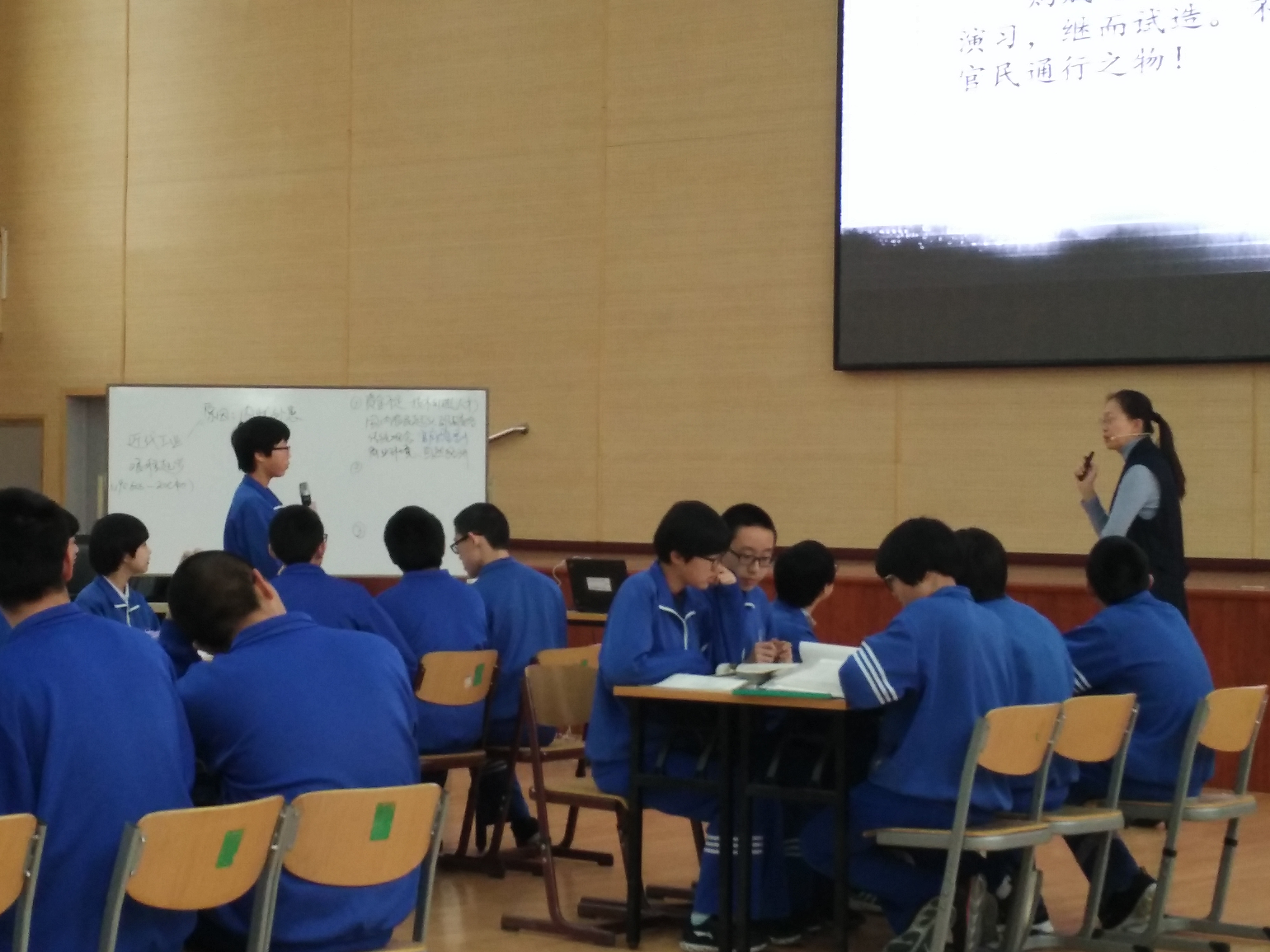 第二节课是朝阳外国语学校胡雯静老师的高一历史经济模块的课程《近代工业艰难起步》。胡雯静老师将课程与当下流行的综艺节目《见字如面》相结合,先提前组织同学们分组对有关历史人物留下的一手文献进行阅读,并将成果以板报的形式展现出来,课堂上再以分组讨论的形式引导学生从史料中进一步总结分析中国近代工业艰难起步的过程,体会在当时的时代背景下历史人物的心境和理想,可谓形式新颖,内容丰富,使人印象深刻。