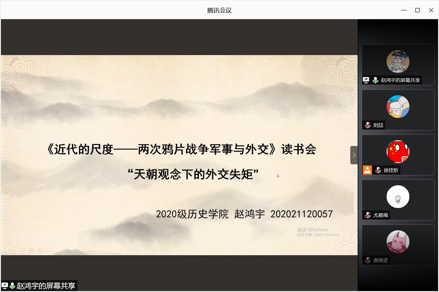 2020年10月24日19:00,春秋学社举办了《近代的尺度:两次鸦片战争军事与外交》(以下简称《近代的尺度》)第二部分“天朝观念下的外交失矩”读书会。本次读书会有幸邀请到【华体会网】2020级硕士生赵鸿宇同学导读。会议由春秋学社常务副社长杨晓锐同学主持。