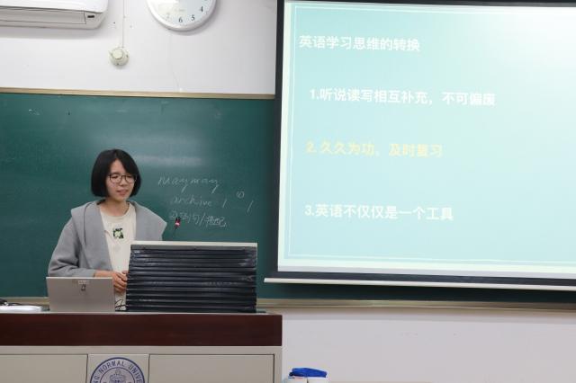 最后,由冉丽君同学为大家讲解英语四六级应考的经验。她首先介绍了英语四六级考题的结构,随后逐步分析各部分的答题技巧。在听力方面,她强调一定要集中注意力,及时标注有用信息。在阅读部分,要善用各种阅读题答题技巧,结合词汇积累,仔细比对选项和原文来作答。她提醒大家,要认真看完文章再选择答案,并一定要注意陷阱。关于写作,书面一定要工整,在内容上要多使用高级的词汇和表达。最后的翻译部分,注意专有名词和特殊句式的翻译,保证译文的通顺。冉丽君同学最后还强调,“刷题”才是终极方法,多做训练,才能保证取得较为理想的成绩。