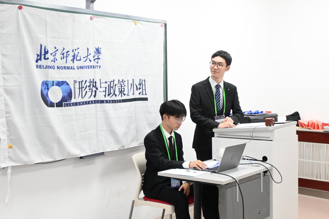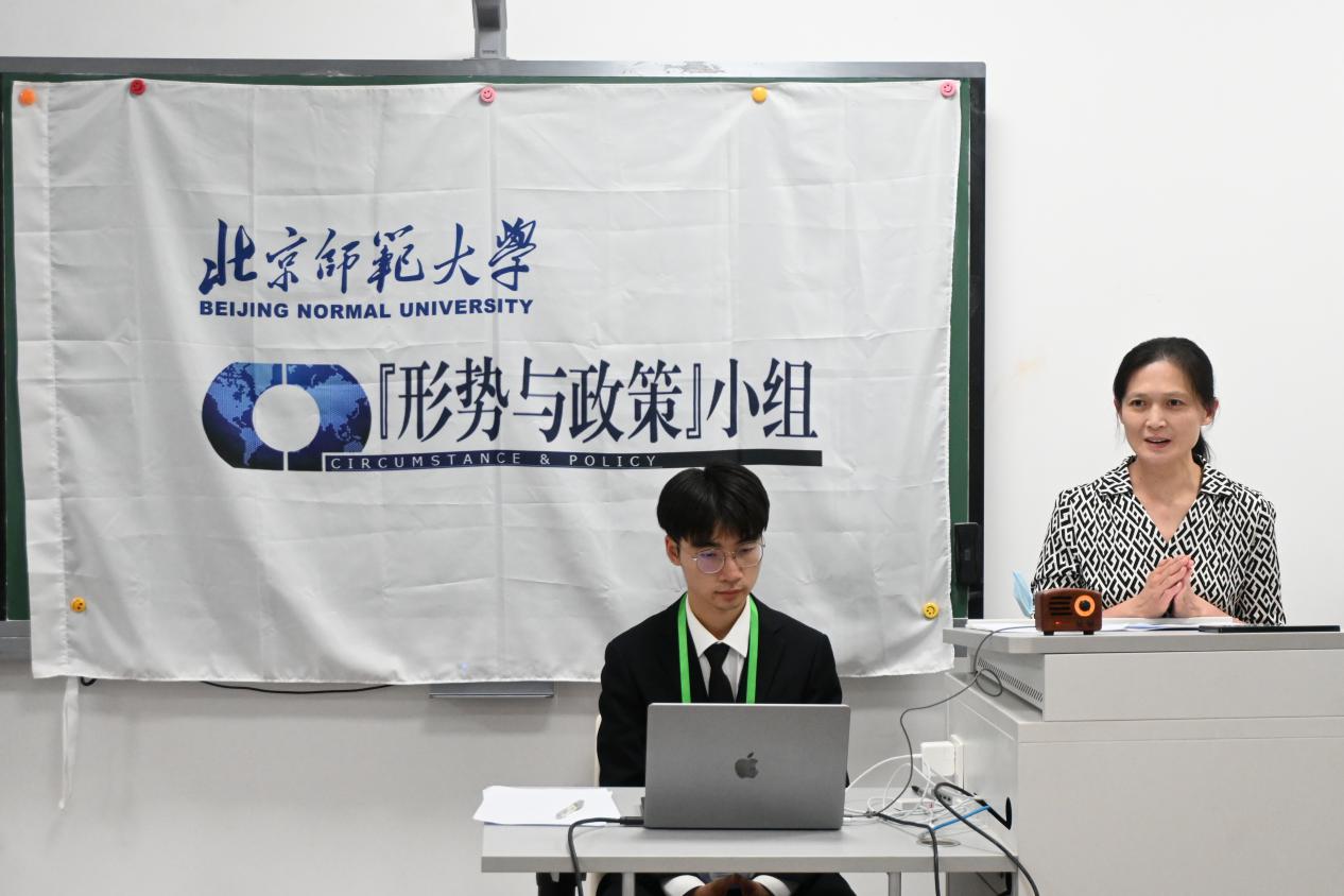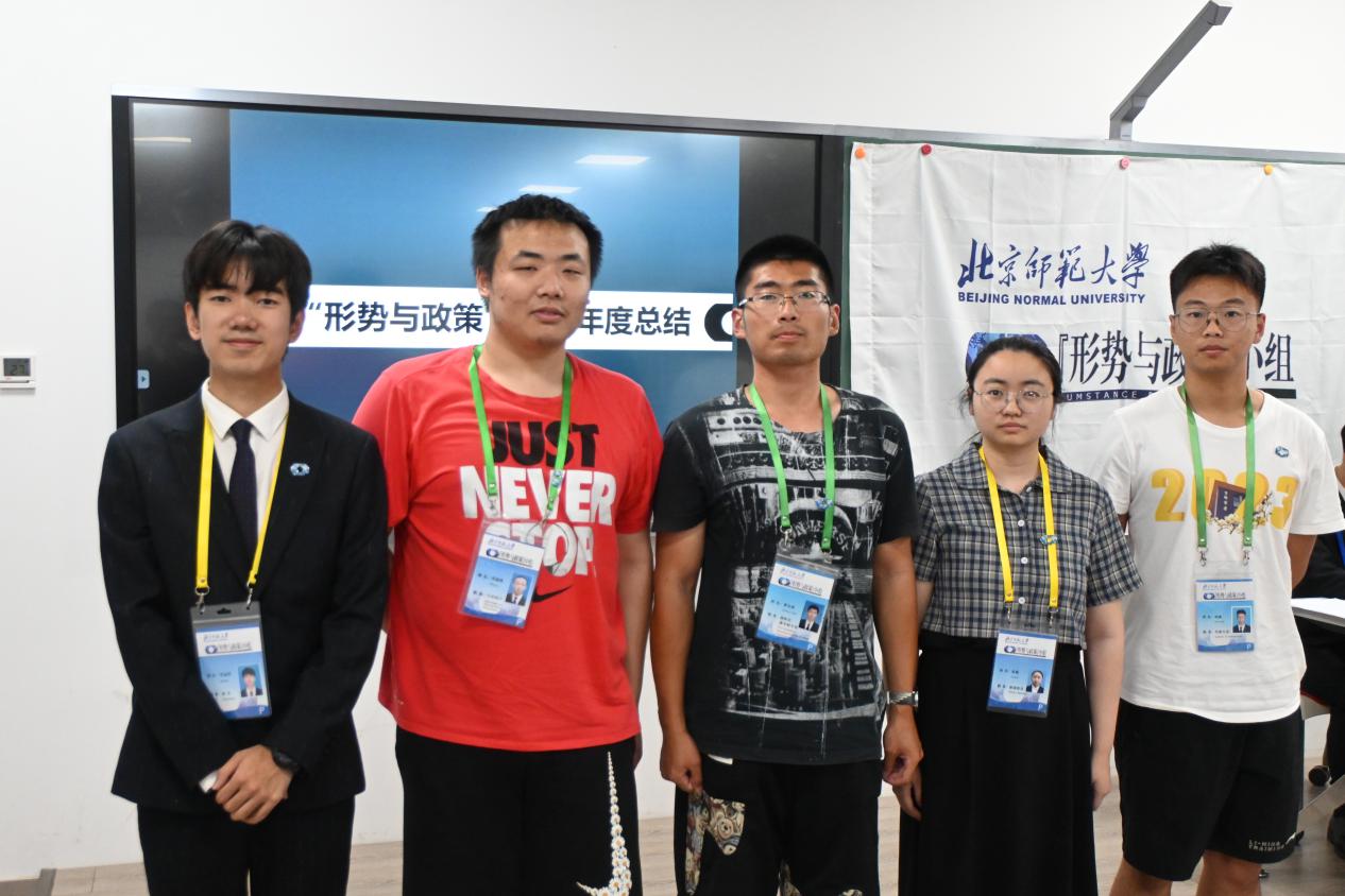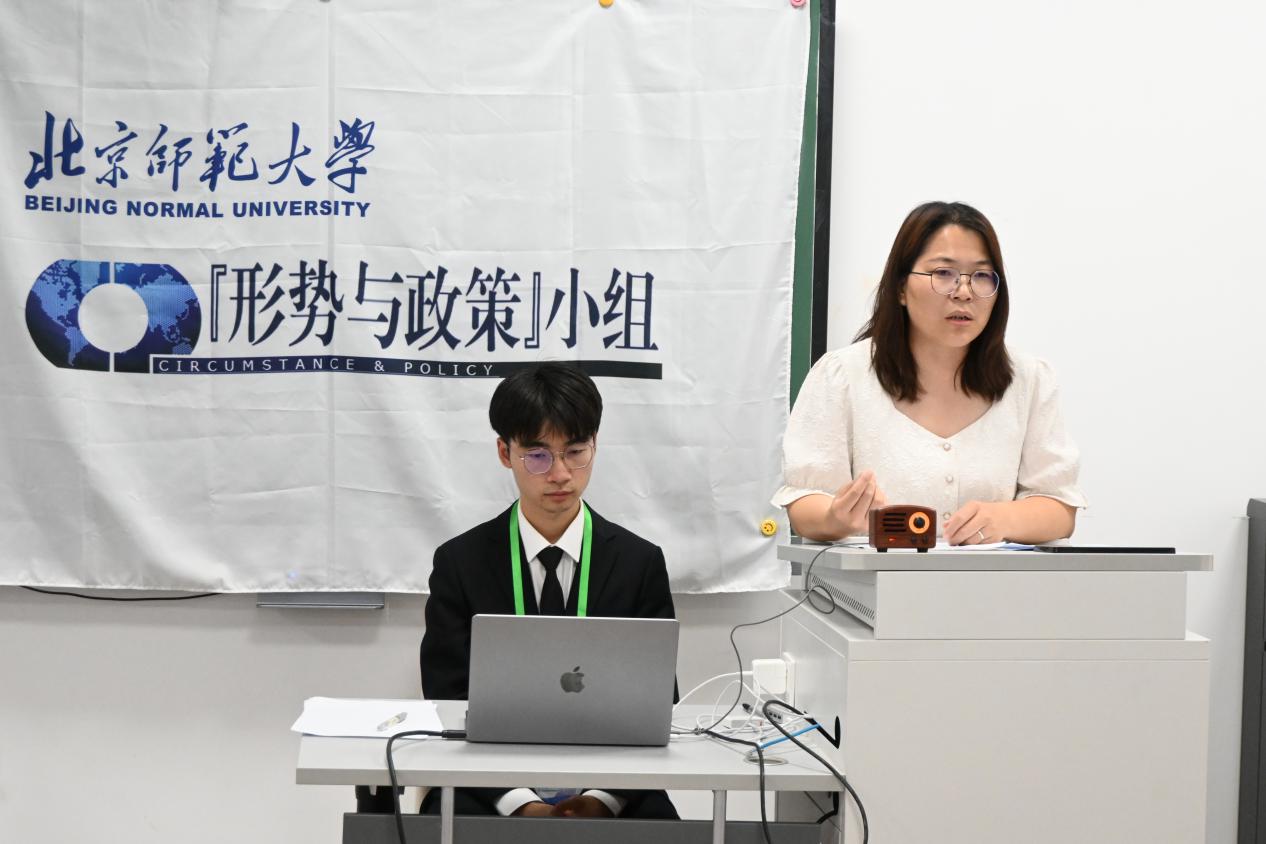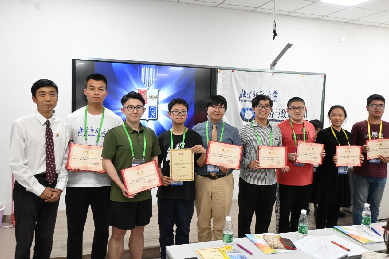 在随后的授牌与颁奖环节中,第十六届“形势与政策”小组秘书长郭婧为新晋组员马晓羽颁发胸牌。本学期,杨新頔、卫垣辰、宋锦在“博古通今 胸怀天下”第十二届和第十三届北京师范大学时事知识竞赛荣获一等奖和最佳风采奖,黄普凡、张熹、洪浩哲在“怀天下·谋共赢”第十七届“外交之星”风采大赛中荣获二等奖,郑旭东老师与杨培艺为上述同学颁发小组制作的比赛纪念光盘。