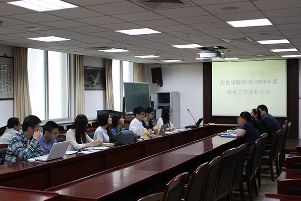 分团委副书记王聪从分团委组织内部建设、日常工作开展和常规活动开展等三个方面介绍了分团委一年以来迎接新生、组织社团招新、 举办“陈垣杯”大学生历史知识竞赛、组建基层团小组和举办主题团日等活动。学生会主席鲍天璐介绍了第三十六届学生会的组织制度创新、常规活动开展、团建等工作的创新点,并反思了工作中的不足,对学生会工作提出了计划与展望。研究生会主席蔡妍妍回顾了研究生会一年以来的工作,并对未来作了展望。春秋学社社长宣柳在述职报告中从“强基固本,完善内部建设”“与时俱进,纪念抗战胜利”“服务社会,弘扬传统文化”和“知行合一,营造学术氛围”等方面对春秋学社一年的活动情况做了回顾。春秋人文报社长陈雅芬介绍了报社的组织结构,在制度创新方面介绍了工作“指令单制度”,着重说明了第二届家史征文大赛等品牌活动的相关情况,还介绍了制作社团徽章等社团建设工作。“形势与政策”小组组长张俊毅就组织内部建设、日常工作开展、学生活动开展、工作的亮点与成就以及工作中的遗憾及改进工作等几个方面介绍了“形势与政策”小组一年以来的众多精彩活动。       分党委副书记王卓凯老师最后作了总结,她代表历史学院分党委对各个社团的工作给予肯定并提出建议,对各社团负责人表达了感谢,并要求各负责人对社团“时时关心,传授经验”。