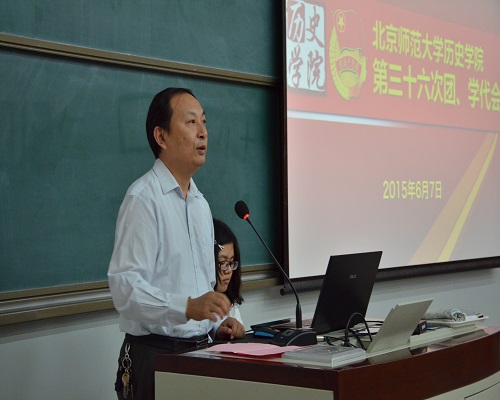 2015年6月7日晚六时,历史学院第三十六届团、学代会在化学楼化一教室隆重召开。出席本次大会的领导和嘉宾有,【华体会网】分党委书记耿向东老师,【华体会网】分党委副书记王卓凯老师,北京师范大学团委副书记孙薇薇老师,【华体会网】分团委书记胡小溪老师,【华体会网】专职辅导员李力老师,【华体会网】2014级本科生班主任、学生事务助理周一帆老师,北京师范大学校学生会主席宋涞同学。