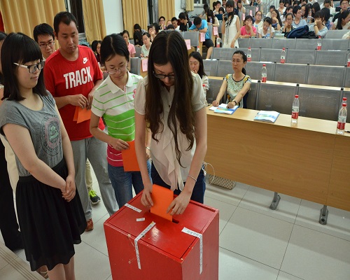 在简短的休息和嘉宾离场后,大会开始了第三十六届团、学代会的换届选举工作。整个选举过程民主、透明、合理合法。首先由历史学院第三十五届学生会副主席毛晓琳为大会宣读选举办法并由代表举手表决,毛晓琳同学说明本次大会的民主选举原则是简单多数,即超过代表人数的二分之一即视为有效。该选举办法得到代表全票通过。接下来由祁洪福同学向大会作候选人资格审查报告并得到全票通过。毛晓琳同学在此之后又向大会宣读总监票人,监票人名单,得到代表全票通过。紧接着是大会第八项,即各候选人作竞选演说。16名竞选人按顺序上台演讲。在不超过三分钟的演说中,各候选人展示了自己的工作能力和工作设想,体现出了愿意为学院和学生服务的信心和能力。演说结束,各候选人和各工作人员就位后,总监票人周一帆老师开始主持大会选举工作:封闭会场,现场封闭票箱,现场拆封选票,统一组织填写选票和按规定顺序投票,最后全体监票人将票箱搬离现场进行计票。严谨和公正的顺序不仅保证了代表们的意愿得以充分表达,也贯彻落实了团、学代会透明严谨的宗旨。在计票过程中,与会代表通过观看我院各学生社团总结视频回顾各社团一年来的丰富成果。紧接着由历史学院分党委副书记王卓凯老师为大会致辞,王卓凯老师肯定了这一年来各组织的工作,也提出了殷切的期望,希望各组织能够团结一致,为了历史学院更美好的明天而不懈奋斗。此后,各候选人来到会场前,与在座的老师同学进行互动,解答他们提出的问题,再次阐明自己的理念和主张。随着计票结束,大会也接近尾声。胡小溪老师宣布计票结果,并由王卓凯老师为当选者颁发聘书并且与当选者合影留念。大会进行最后一项:由第三十五届历史学院学生会秘书处申宇鹏同学宣读大会倡议书。倡议书包含深情,抒发了历史学院各组织团体和各位同学愿意为历史学院辉煌灿烂的明天尽自己的一份力量的坚定的意愿。表达了历史学院是一个积极进取,顽强拼搏的集体,显示出了当代大学生的理想与信念。