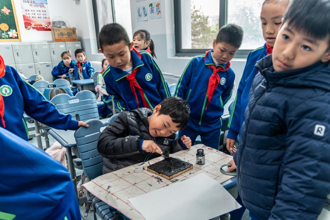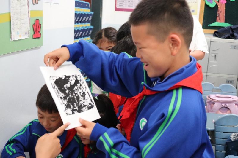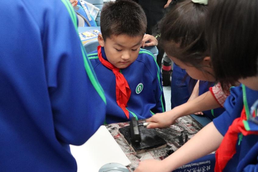 随后,学社的两位小老师亲自示范,向同学们展示了雕版印刷的基本技巧与方法。在老师的悉心指导下,同学们很快掌握了涂墨、刷墨等具体步骤的要领,并开始动手尝试。经过一番努力,同学们很快就成功拓印出了各式各样的图案。