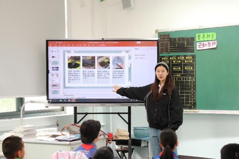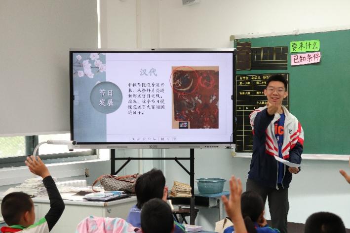 陈致浩、刘桉朵同学向三(3)班介绍了中国四大传统节日之一的中秋节。他们首先讲述了中秋节从古代祭月仪式发展为团圆佳节的过程,并通过“嫦娥奔月”“吴刚伐桂”等传说和吟咏中秋的经典诗句,展现古人对明月的浪漫想象和对亲人的深切思念。随后,学社成员将目光转向与中秋节存在联系的传统习俗——雕版印刷。通过实物展示与视频解说,同学们了解到这项技艺不仅用于佛经、书籍的传播,更与中秋习俗深度融合,用来印制兔儿爷画像、月宫图,为佳节增添雅致。