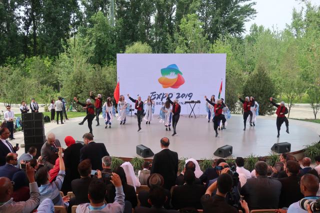 巴勒斯坦独立大学艺术表演团队带来了独具民族特色的歌舞表演,引起了到场嘉宾和观众阵阵欢呼,嘉宾们还走上舞台和演员们热情共舞。巴勒斯坦传统服饰展示环节将开幕活动推向高潮。活动结束后,我院学生向马赫达维大使介绍了“形势与政策”小组近期发展情况。大使热情地与每位同学握手,愉快地与大家在在世园会巨幅标识前合影留念。