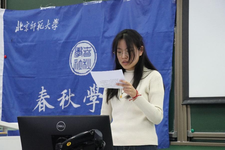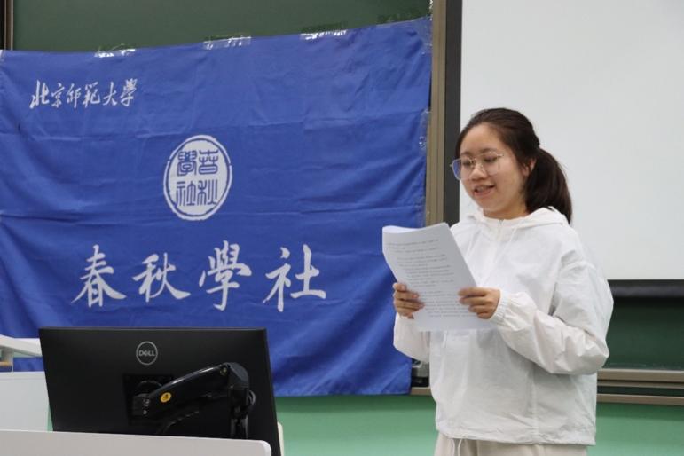 最后,社长江怡慧同学进行了发言。她回顾了自己三年来在学社的成长与收获,从最初怀着对历史学的热爱加入学社,到通过积极参与各类学术活动不断提升专业能力、深化学术兴趣。在这段难忘的旅程中,她特别感恩学社这个充满历史底蕴和人文温度的大家庭给予的滋养,希望大家在社团工作中始终怀抱对历史学的热忱,传承学社友爱互助的精神,共同书写春秋学社更精彩的明天。