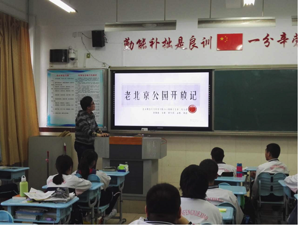 2015级硕士生第二党支部孙雅薇、朱峰、盖恒、黄岑玥为高二理科班授课。主讲的朱峰同学围绕“老北京公园开放记”这一主题,由几个北京著名公园图片入手引入课堂主题,从辨析“公园”的概念到介绍中国最早的公园,以颐和园的开放作为主线,穿插万牲园、中山公园等公园的开放历程,形象生动地展示了老北京公园丰富多彩的开放历史。课堂中播放的精彩视频,更为整节课增色不少。上课过程中同学们认真听讲,教学秩序井然,同时积极配合老师。