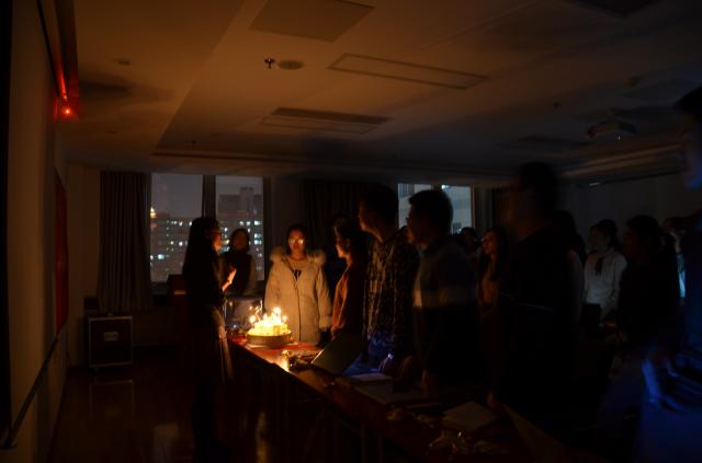 最后,大家在齐声喊出社训“学而不厌,行之有恒,春秋代序,人文化成”之后,一起分享蛋糕,大会在欢愉的氛围中结束。