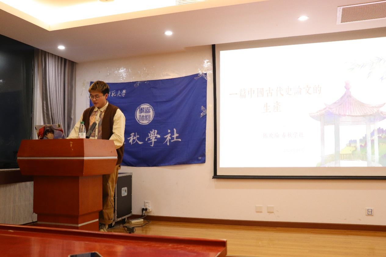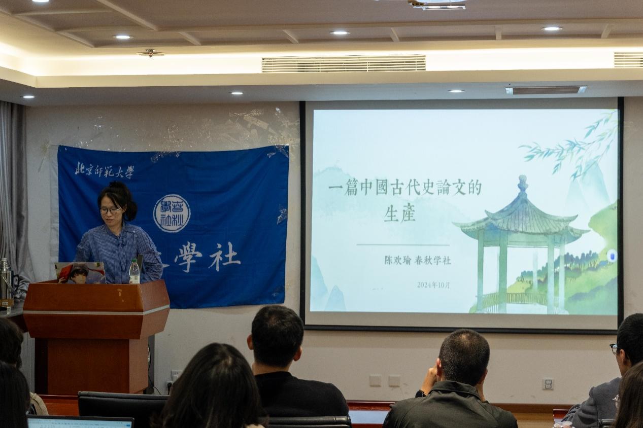 首先,陈欢瑜同学分享了中国古代史论文的写作经验。她以“为什么写论文”这一问题引入,提出了论文写作的两个前提,即深入阅读经典著作以建立学术品味,并广泛涉猎基本史料。在基本学术规范方面,她指出,撰写文献综述应追求全面性与精确性,在广泛搜集研究成果的基础上关注其内在联系。引用史料时应当追溯其原初状态,做好校勘工作。随后,她详细阐述了论文写作的基本方法。文献阅读和新材料的出现都是启发选题的重要方式;要在充分了解断代史料的基础上制作史料长编;修改论文时可以多向朋友与老师寻求具体建议。
