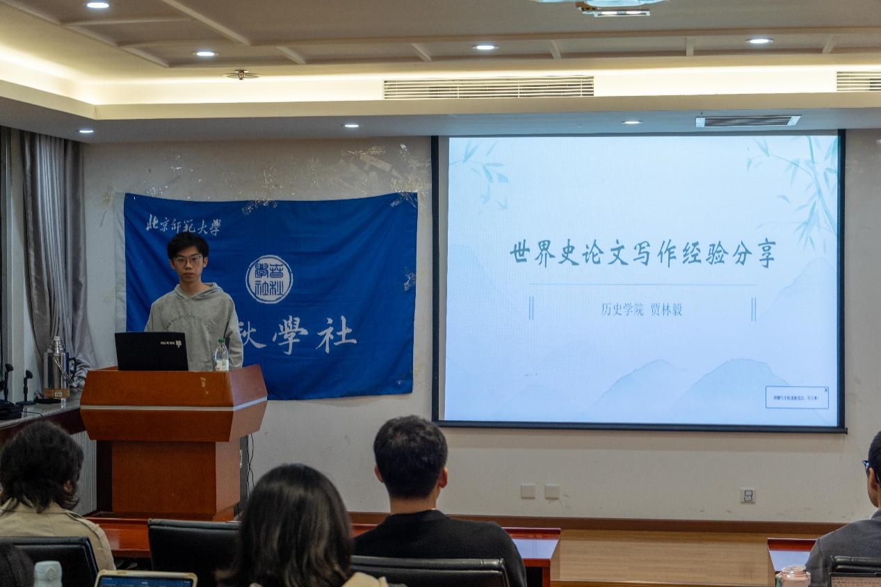 随后,贾林毅同学分享了世界史论文的写作经验。他鼓励同学们关注课堂提及的学术热点,以问题为导向阅读学术著作和原典,并积极参与讲座活动,为确定论文选题提供灵感。在构建论文框架时,贾林毅同学特别指出提问法的重要性,并以具体论文为例,引导同学们经历了从提问、查阅资料到再提问、调整思路的完整框架设计流程。此外,他还介绍了搜集史料的多种途径,包括网络资源、研究综述、电子书和数据库等。