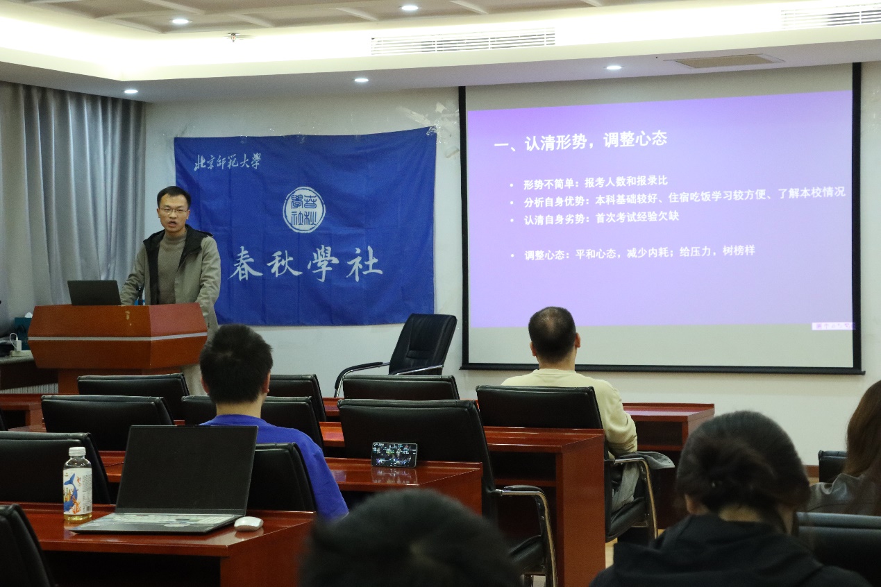 随后,考研至本院世界上古史专业罗马史方向的南画洋同学发言。他分享了自己的考研故事,鼓励同学们树立自信、敢于尝试、坚定前行。针对心态调整,他以幽默诙谐的语言分享了自己的经验,提出要多与他人沟通,在交流中缓解压力,共同进步。最后,他叮嘱同学们在紧张备考之时注重身体健康,合理分配考场时间,尽力而为。