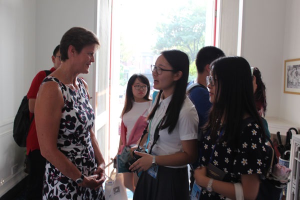 英国驻华使馆的开放日活动兴起于2015年,是一项以展现英国文化为主旨、促进中英文化交流的特色活动。2015年2月,英国前首相卡梅伦在一年一度的中国春节贺辞中,将2015年称为中英关系史上的黄金年,同年5月,提出打造中英关系的“黄金时代”。同年10月,中国国家主席习近平对英国进行国事访问,指出“中英两国携手,恰逢其时”,期待着“共同开启中英全面战略伙伴关系的‘黄金时代’”。在中英合作不断深化的今天,使馆开放日使两国青年相遇相知。我院学生代表、2016级本科生彭麒霖等同学在活动间隙与英国驻华大使吴百纳面对面交流,表达了加强中英教育合作、推动两国青年友好的愿望,受到大使女士的积极回应。