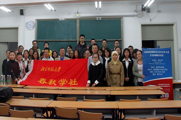 2015年10月30日晚8时,著名历史学家董小川教授的讲座“从新闻署的解体看美国对外文化扩张战略的变化”在教四楼201教室成功举办。本次讲座由由新世界出版社主办、【华体会网】春秋学社承办。讲座吸引了众多历史专业学生和历史爱好者的参与,现场气氛热烈、座无虚席。