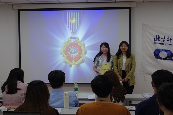在授牌和颁奖环节,第十二届“形势与政策”小组秘书长陈雁为新晋组员和院系联络员颁发胸牌。本学期内,徐源辰、卢元齐、余可绎参加2019年首都高校新生时事知识友谊赛并获得冠军,高超、孟子煜、邢晓坤、李才林参加第十五届“和合生•共命运”首都高校外交之星风采大赛并获得季军,赵文博、洪思音、唐洪超参加第八届京津高校国际关系史竞赛并获得亚军,赵文博还获得最佳风采奖。牛小游老师为上述同学颁发了纪念光盘。徐源辰同学宣读了小组年度获奖名单和颁奖词,胥晨曦老师为获奖同学逐一颁发证书并合影留念。生动活泼的颁奖词、风趣的奖项名称与每位获奖同学的特质相吻合,让大家在欢快的气氛中回忆起令人感动的一幕幕场景。秦雅婕同学为“形势与政策”小组2015级毕业成员代表颁发纪念徽章。