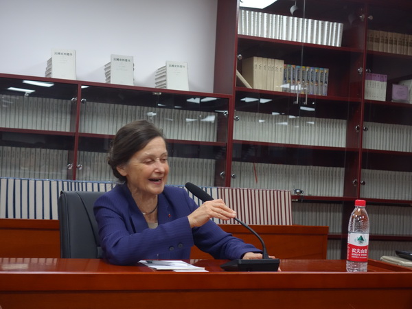 当晚八时,精神矍铄的巴斯蒂夫人甫一步入演讲厅,现场立即响起了热烈的掌声。今年适逢中法建交55周年,巴斯蒂夫人正是在中法建交的1964年来到中国负笈求学,作为两国交往的亲历者和见证人,对中国怀有很深的感情。她首先就能够重访北京师范大学并与师生进行交流表达了喜悦和感谢。谈到年轻时在北京大学学习工作的经历,她饱含深情地回忆起自己求学路上的恩师,感恩于著名历史学家卲循正、陈庆华对她的悉心指导,并对当代中国的青年学子的学术发展提出了殷切的鼓励与期望。