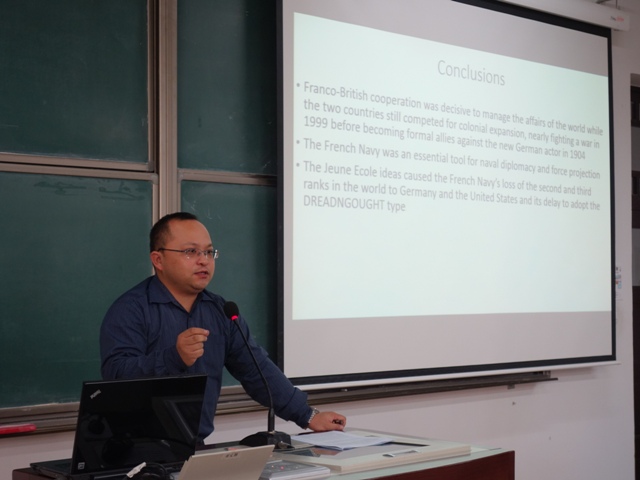 2015年12月10日-13日,应【华体会网】邀请,法国国家海军史研究中心首席专家、知名学者亚历山大·谢尔东-杜普莱教授(AlexandreSheldon-Duplaix)前来北京师范大学讲学。12月11日上午,杜普莱教授走进《世界近代史》课堂,在教二教室为【华体会网】级本科生作了题为《走向无畏之海——铁甲舰时代的法国海军》的讲座。讲座由历史学院世界近代史教研室江天岳博士主持。历史学院世界现代史教研室贾珺副教授出席了讲座。前来聆听的还有来自北京师范大学和其他首都高校的学生和军事史爱好者。