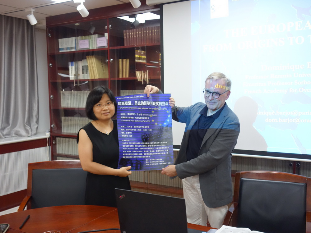 2019年6月19日下午,法国著名历史学家、索邦大学荣休教授、法国海外科学院院士巴尔若(Dominique Barjot)应邀到访我院,并以“欧洲联盟:历史的形塑与现实的挑战”为主题,在主楼743会议室为师生作了一场精彩的专题讲座。此次讲座系我校励耘学术讲堂历史学系列讲座之一,由教务部主办,历史学院承办。讲座由我院世界近代史教研室江天岳老师主持,庞冠群副教授、贾珺副教授等学者出席了讲座。本次讲座还吸引了首都高校学生与历史爱好者前来聆听。