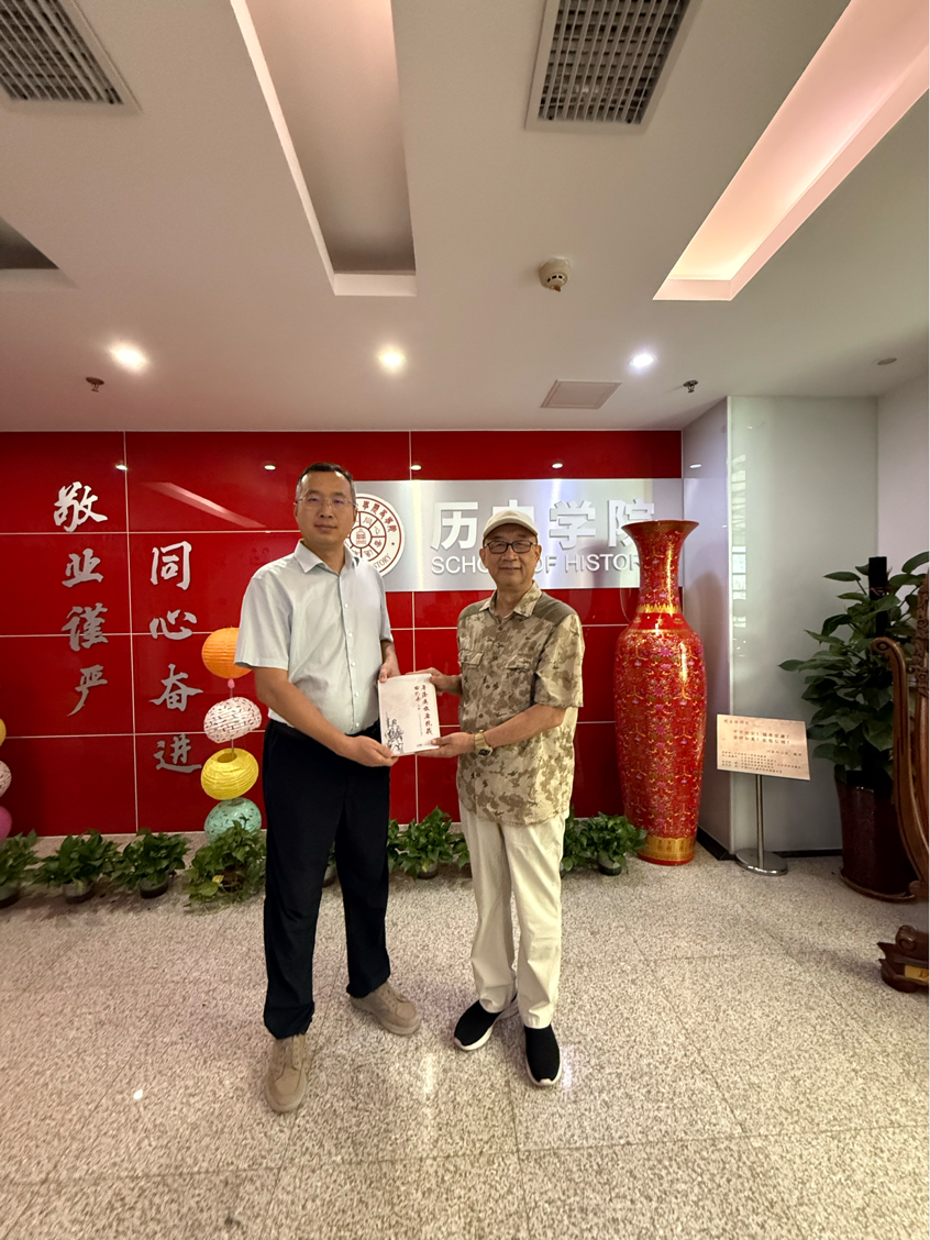 2025年9月10日,广州市东江纵队研究会黄彦辉先生来学院赠送研究会新出版的《粤港澳敌后抗战回忆录》(上、下册)10套,中国人民抗日纪念馆——北京师范大学国家革命文物协同研究中心副主任、历史学院孙会修教授代表学院接受赠书。