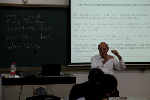 恩格伦教授首先对近现代历史人口学研究领域的主要理论进行了分析,包括马尔萨斯的人口论、人口变化理论、欧洲人口模式说等,同时对以这些理论为基础的代表性个案研究进行评价,指出其优点与不足。在理论分析之后,恩格伦教授结合自己的问题,以近代中国台湾的鹿港和荷兰东南部的内梅亨为比较对象,对这两个曾经非常繁盛的城市的婚姻和生育情况进行对比分析。恩格伦教授的研究以这两个城市的家庭登记档案为基础史料,通过统计分析等手段,加上文献资料,尝试对传统的说法进行分析和验证。恩格伦教授认为,总体而言,虽然在结婚时间、结婚率和生育时间等方面有所不同,但在没有节育措施的情况下,实际上这两个城市的生育变化情况大致相同。影响生育的主要是生物学层面的差异,宗教观念及习俗并非决定因素。马尔萨斯等对中国人口发展的看法并不完全正确。恩格伦教授还与在场的师生进行了交流,回答大家提出的问题。