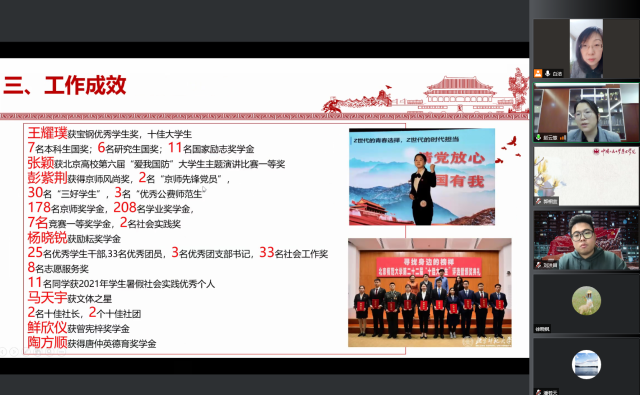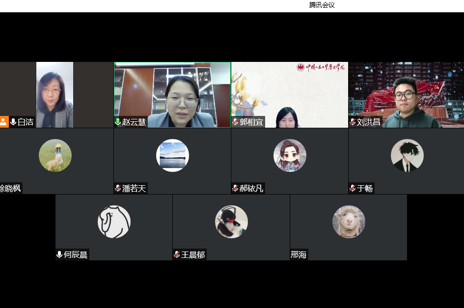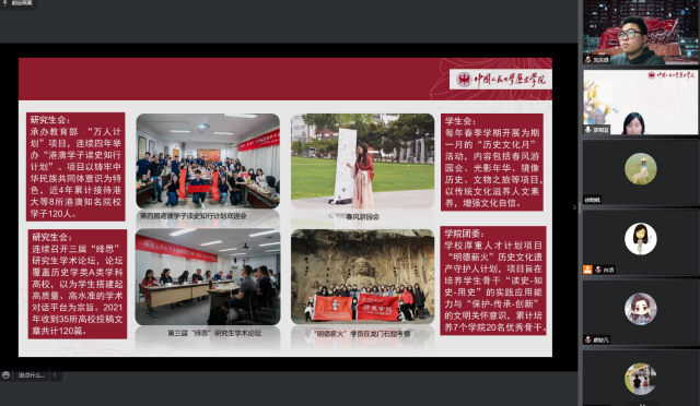 3月17日下午,中国人民大学历史学院党委副书记白洁带队与我院学工进行线上交流学习。会议由【华体会网】党委副书记赵云慧主持,中国人民大学历史学院党委副书记白洁、团委书记郭相宜、团委副书记刘洪昌、【华体会网】学生工作办公室潘若天老师、张辞修老师、徐晓枫老师及两院学生会、研究生会等学生组织负责人参加了座谈。