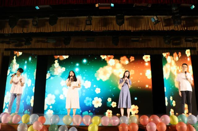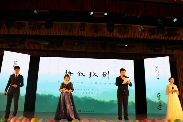 随着舞台灯光暗下再亮起,四位主持人走到台前,他们分别是:2015级本科毕业生冉博文,2016级硕士毕业生齐琪,2016级硕士毕业生王宁和2015级本科毕业生陈盼。