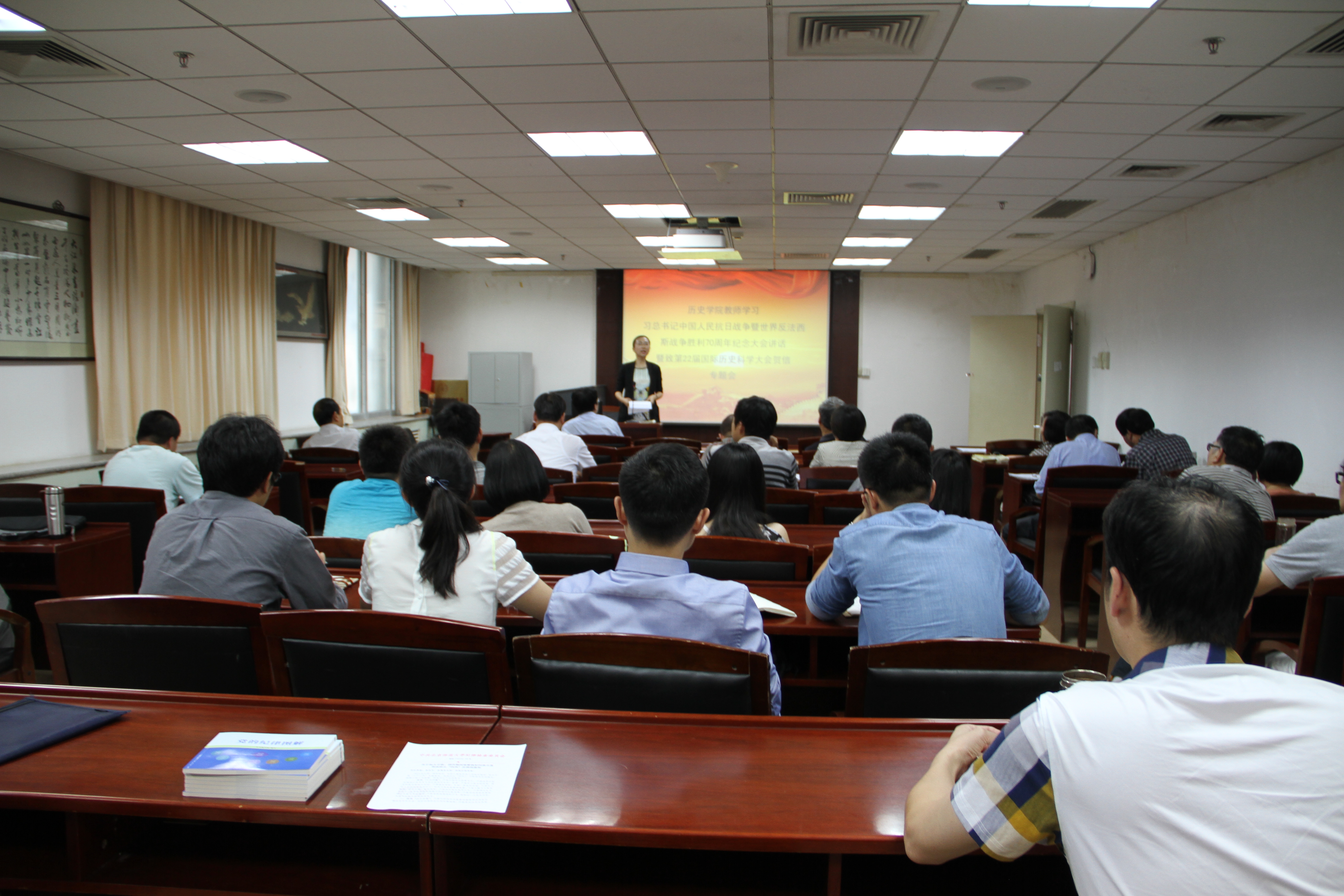 9月16日下午,我院召开新学期全院教师大会,集体学习了习近平总书记在纪念中国人民抗日战争暨世界反法西斯战争胜利70周年纪念大会上的讲话,以及习近平主席致第22届国际历史科学大会的贺信。大会由院长杨共乐主持。