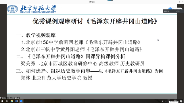 活动由项目首席专家郑林教授主持,内容包括《毛泽东开辟井冈山道路》优秀课例观摩、同课异构课例分析以及《如何选择、组织历史教学内容》讲座三个部分。