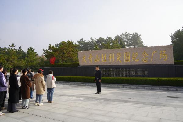 8日上午,学院师生奔赴临沂蒙阴县的孟良崮战役纪念馆。师生一行首先跟随讲解参观了孟良崮战役纪念馆主体展览,深入学习孟良崮战役中华东野战军的英勇事迹。馆陈参观结束后,师生前往英烈亭,在粟裕将军墓前举办敬献花篮仪式。蒙蒙细雨中,全体师生肃立,向粟裕将军之墓三鞠躬、敬献花篮并整理绶带。在党旗前,师生党员重温入党誓词,庄严宣誓,将对华野烈士的缅怀之情融进铿锵有力的誓言中。随后,师生登至孟良崮主峰实地参观孟良崮战役遗址,在大崮顶“孟良崮战役纪念碑”前,学院师生实地感悟到了毛主席所说“兵民是胜利之本”,深切领会到“党群同心、军民情深、水乳交融、生死与共”的沂蒙精神。