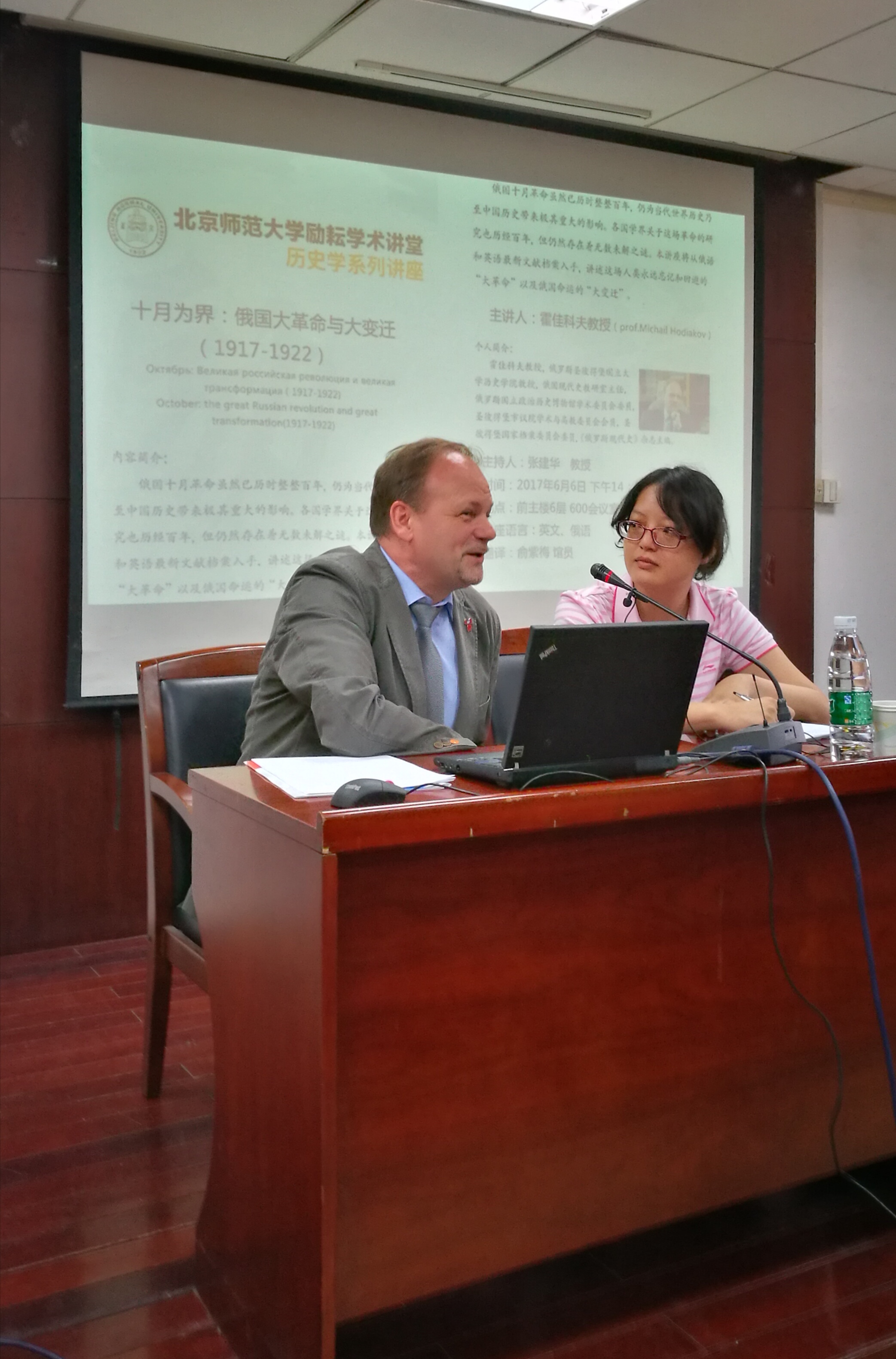 光临讲座现场的有原中国驻白俄罗斯大使馆新闻参赞、《中国青年报》驻俄罗斯首席记者、莫斯科外国记者协会主席、国务院欧亚社会发展研究所前副所长,现任中国人民大学俄罗斯研究中心副主任王宪举教授、北师大历史学院德国史专家孙立新教授、北师大历史学院日本史专家陈奉林教授、北师大历史学院法国专家江天岳讲师,以及来自我校其他院系的师共计40余人听取了讲座。讲座由我院张建华教授主持,由我校图书馆研究馆员、历史学院博士生俞紫梅担任全程翻译。
