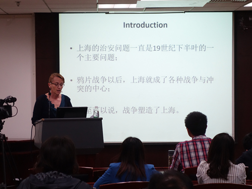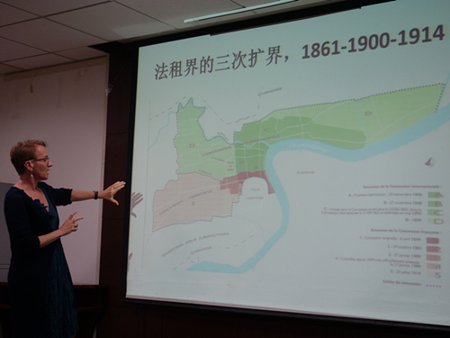 在讲座的第三部分,柯蓉教授认为,上海法租界发展出了一种混合了法国警察文化和中国本土特色的自治方法,是战争塑造了上海,也塑造了上海市民的身份认同。在接下来的提问环节中,柯蓉教授和同学们交流了一些问题,她指出,上海法租界和法国在越南、非洲的殖民地性质不同,也与法国在天津、武汉、广州的租界存在差异,界内各国侨民汇聚、华洋杂处,呈现出特殊的城市风貌和历史轨迹,也是值得进行深入学术研究的场域。她同时指出,上海法租界当局与“青帮”在毒品交易、赌场经营等方面的暧昧合作,也对上海的发展产生了一系列负面影响。