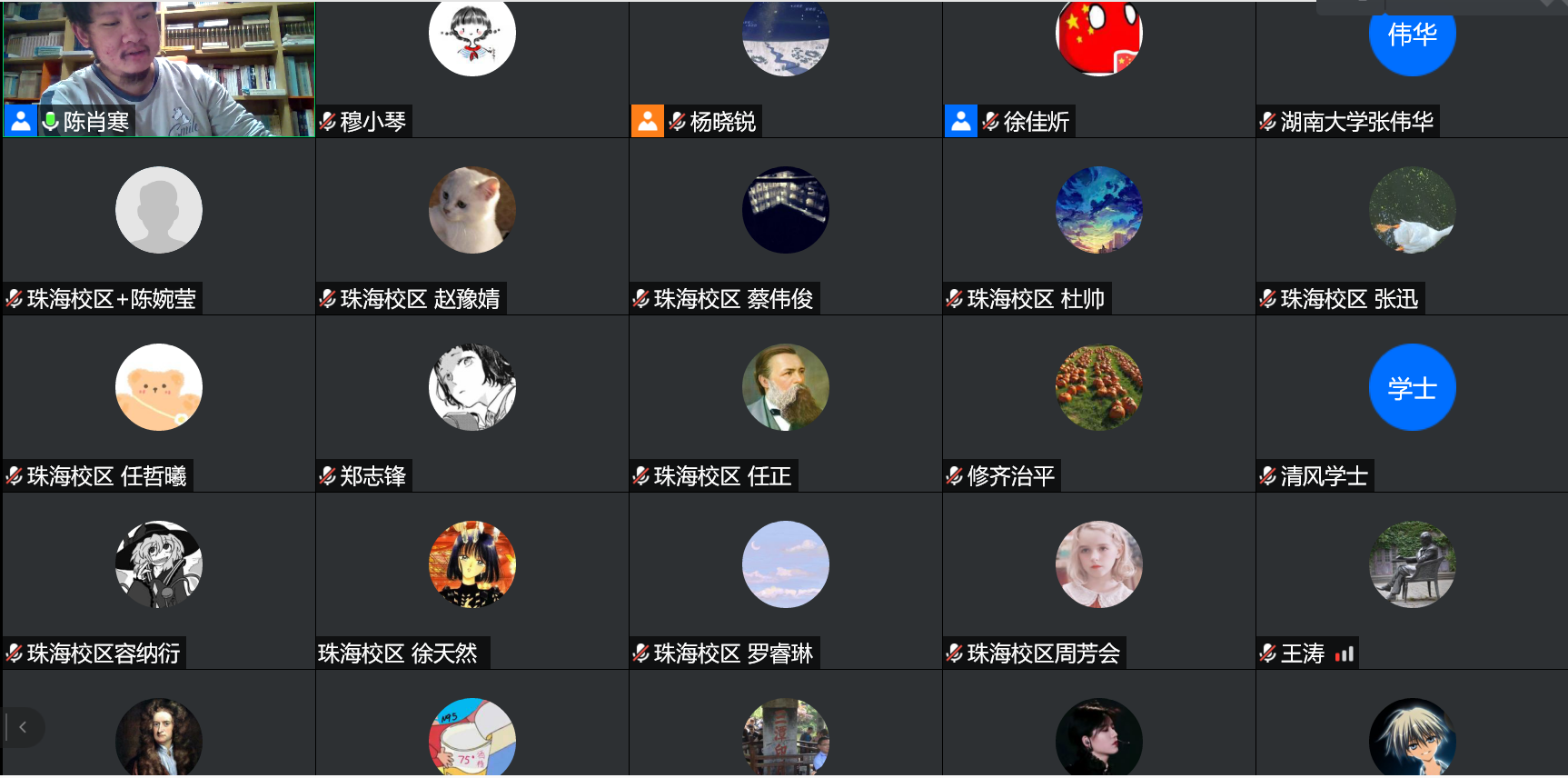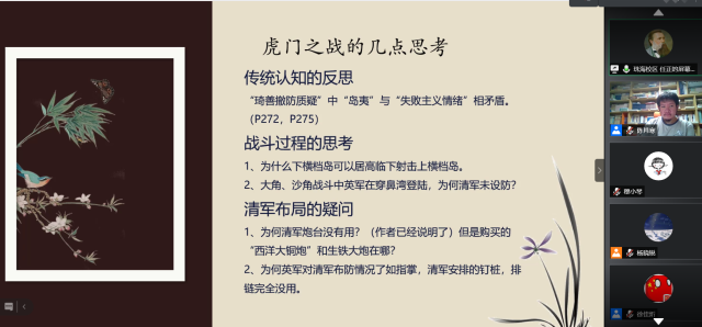在个人展示环节,来自北师大珠海校区的任正同学提炼了《近代的尺度》第三部分各篇的主要内容和观点,分享了自己阅读本书的心得。他结合地图介绍了虎门之战、浙东之战、吴淞之战、大沽口之战的过程,详细分析了清军在排兵布阵上的特点进而从阐发了自己对清军战争屡屡失败的原因的思考。同时,任同学也提出了在阅读过程中产生的疑问。陈老师进行了细致的解答。