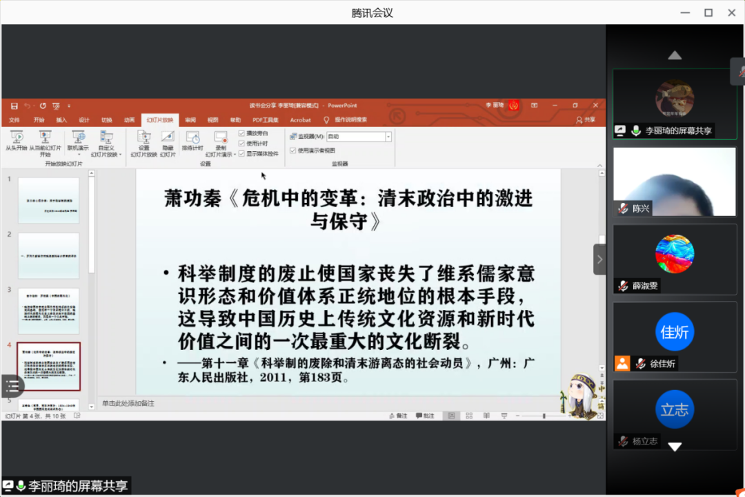 分享会首先由历史学院2018级本科生李丽琦同学进行主题展示,她主要分享了自己阅读《权势转移》第二章内容的心得。她的分享包括两部分。在第一部分中,她通过对比《中国的现代化》、《危机中的变革:清末政治中的激进与保守》和《党员、党权与党争:1929-1949年中国国民党的组织形态》三部著作与《权势转移》中对于晚清废科举兴学堂的论述,指出《权势转移》为科举制的废除提供了多方面的表达。在第二部分“惶恐与出路”中,李丽琦同学依据史料对《权势转移》中有关科举废除后士人心态变化和清廷善后举措的内容进行了分析考证。《权势转移》中清末山西举人刘大鹏的《退想斋日记》体现出内地大部分士人在科举废除后所共有的惶恐和忧虑心态。《政务处奏酌拟举贡生员出路章程》(以下简称《章程》)则从政府角度反映了清廷应对科举废除的具体措施,其内容一方面与《退想斋日记》相互印证,体现了近代社会政治思想的巨大变迁,另一方面也证实刘大鹏的记录不乏主观片面和言过其实的成分。当然,《章程》的具体贯彻实施情况仍然有待商榷。