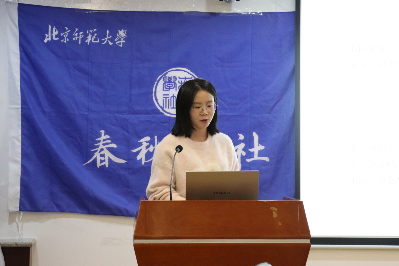 接下来,韦兆杰同学就中国史专业现当代史方向分享备考经验。他逐一说明了信息搜集、材料准备及临场发挥等各个环节中需要注意的问题。同学们应通过多种渠道广泛搜集目标院校的相关信息,用心撰写出富有特色的个人陈述,准备多份材料以应对可能的突发需求。结合自己的面试经历,他还建议同学们务必提前做好充分准备,同时根据现场情况灵活应变。