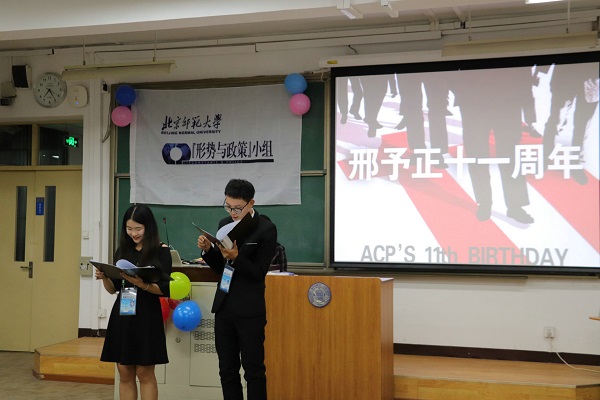 2018年10月28日晚,我院“形势与政策”小组成立十一周年庆祝晚会在教二208隆重举办。从小组领导岗位上退下来的老成员江天岳、宋文经、陈鸣悦、付豪、刘骥跃、张俊毅、王帅捷、叶子豪、田奥凡、卢冰屿、徐子钧、何昕、赵文博、陈子梁、刘泽元等出席晚会。来自十多个年级的小组新老成员欢聚一堂,共同向十一岁的小组送上最真挚的祝福。远在英国伦敦、奥地利萨尔茨堡、美国纽约、加拿大温哥华以及祖国各地的小组成员黄亮、丁旭辉、郝小雯、田天、徐喆昕、王琳冰、陈俊伶、高鑫、吴科杰、王聿闻、王昭、赵天宇也发来形式多样、热情洋溢的视频,同祝小组十一周年华诞。