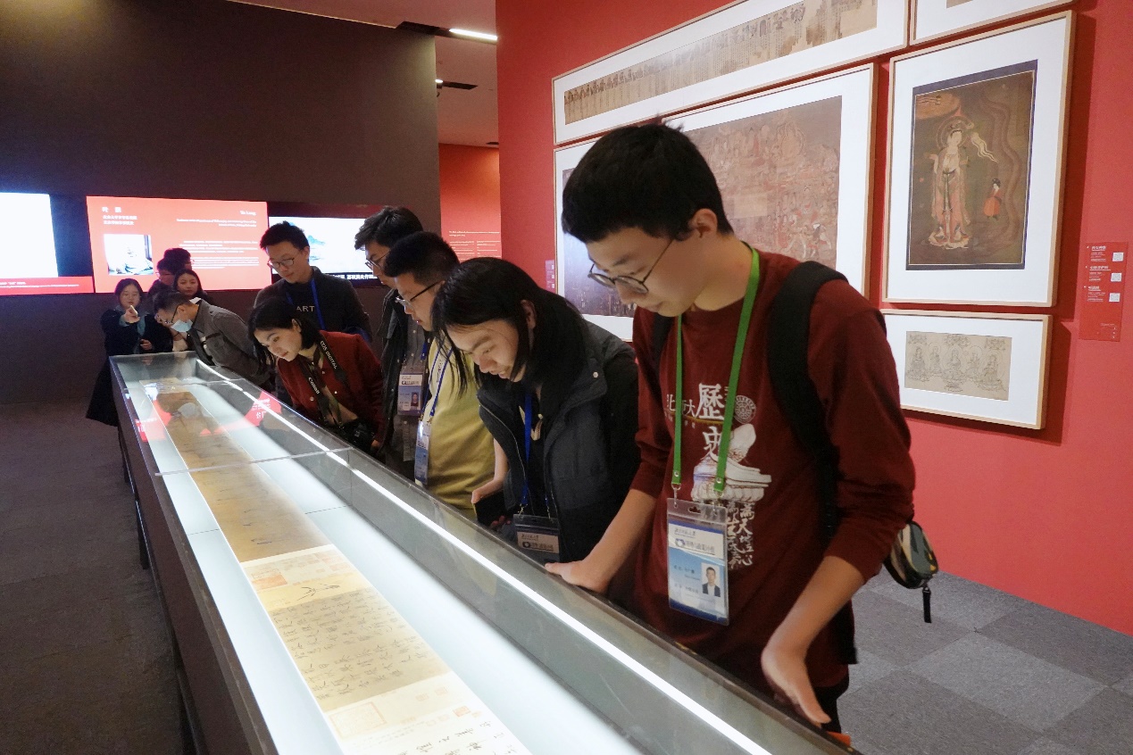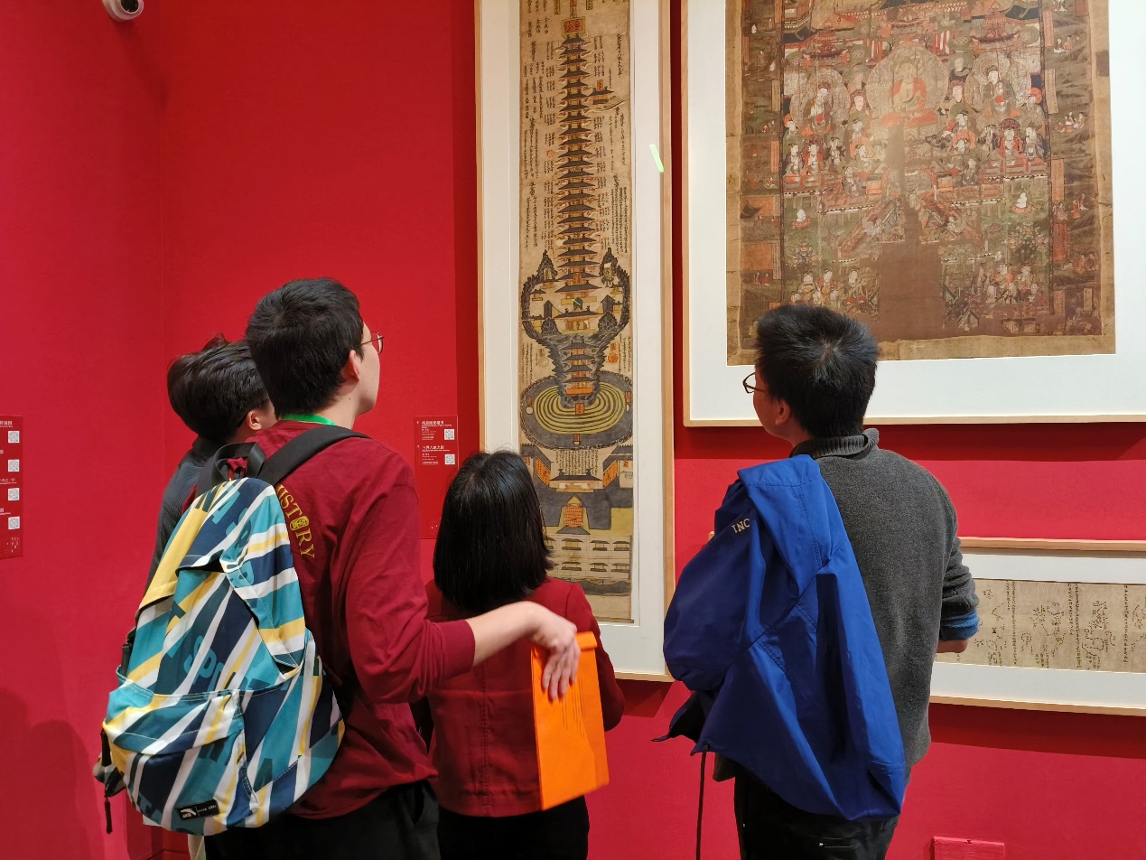 在观展过程中,同学们不时驻足,欣赏名画的图案细节,讨论其中的重要元素,探求历代绘画的独特文化内涵与思想内蕴。从先秦到明清,我国绘画体系不断完善,内容不断丰富,绘画技艺也渐趋精细化。本次展览对中国古代绘画发展历程进行了详细梳理,使同学们能直观地透过绘画把握时代风潮与思想脉络,开拓思想维度,提升精神境界,为日后的学习与研究打下坚实的基础。