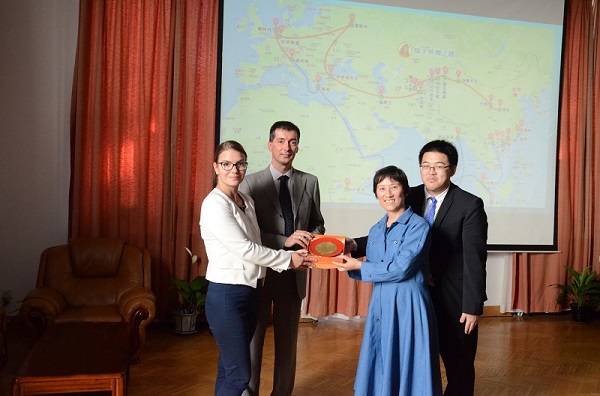 宁欣教授在发言中,回顾了自己率团赴布达佩斯中欧大学参加学术交流活动的经历。同时,宁教授代表历史学院,邀请齐丽大使及魏莱士参赞出席我院和匈牙利中欧大学历史系将于10月22~23日举办的“比较视野下的中世纪与欧洲社会治理”(Social Control and Issues of Scale in Medieval Europe and China)国际学术研讨会。宁欣教授还向大使馆赠送了印有“北京师范大学”字样的漆盘。