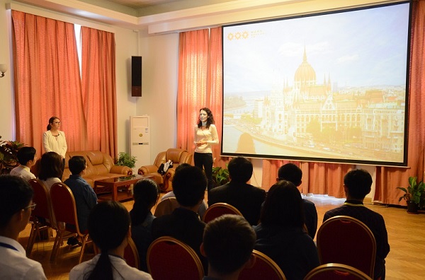 随后,匈牙利文化中心文化干事尹曼妮女士(ILDIKO Nagy)从几张优美的风景照入手,全方位地为同学们展示了匈牙利的国家概况、风土人情,并特别介绍了布达佩斯市古老而富有特色的建筑与造型奇特的公共设施。此外,她还对匈牙利的美食和科技成就等做了详细说明。通过精彩而富有艺术气息的视频,尹曼妮女士向参观者呈现出一个蕴含着古典美学气息,却又不失近代科技之先进性的国度。使馆参赞魏菜士先生则和同学们谈论起中匈关系及中国与中东欧国家的合作。他首先回顾了中匈在历史上源远流长的经济与文化交往,介绍了近年来,特别是“一带一路”战略实施和中国-中东欧国家“16+1”合作机制建立以来,两国关系新的变化和发展,展望了中匈合作建设匈塞铁路的前景。