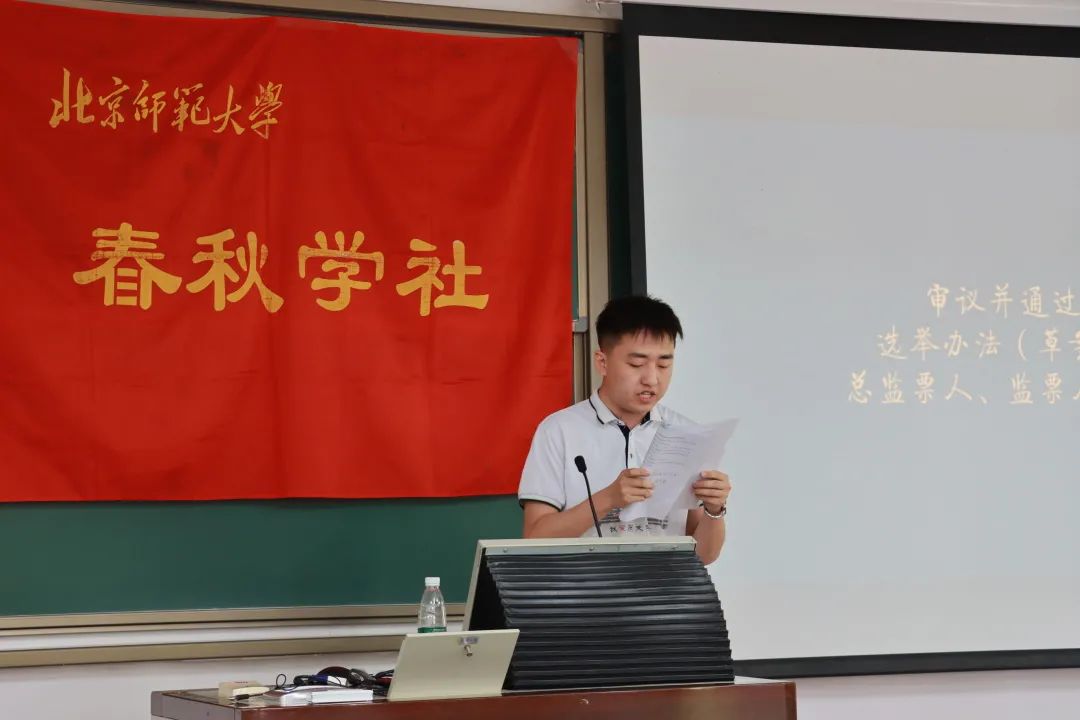 随后,春秋学社第37届社长徐佳炘同学作2020—2021学年春秋学社工作报告,总结回顾了春秋学社一学年的工作,报告经社员表决后一致同意通过。春秋学社第37届常务副社长杨晓锐同学宣读北京师范大学春秋学社第二次理事会换届会议选举办法(草案)及总监票人、监票人名单,获得会议表决一致同意通过。接下来,15位候选人依次发言参与竞选,总结过去的工作,根据自己竞选的职位阐述个人优势,畅谈对未来工作的设想,为学社的发展建言献策。参会代表认真聆听并进行匿名投票。