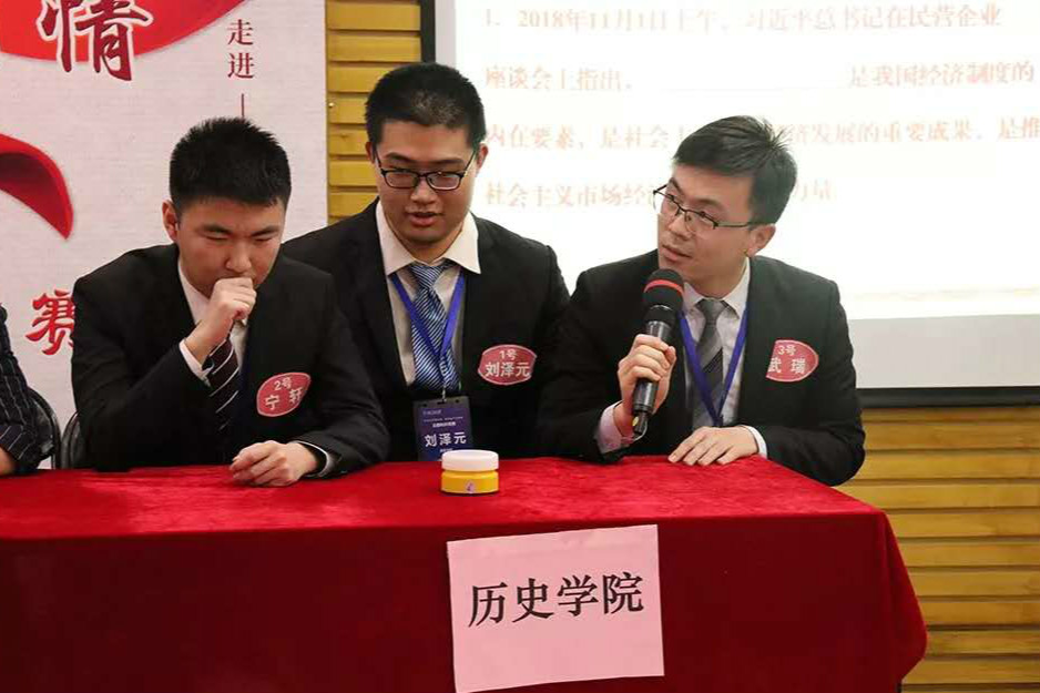 在本次活动中,历史学院代表队由2015级本科生党员武瑞、刘泽元与2016级本科生党员宁轩组成,在初赛笔试中获得了优异的成绩,最终进入决赛,与政府管理学院、艺术与传媒学院、刑事法律科学研究院代表成员同台竞技。四支队伍围绕着改革开放以来党和国家事业取得的伟大成就与宝贵经验、习近平总书记在庆祝改革开放40周年大会上的重要讲话和我校第十三次党代会报告和双一流建设方案等内容,展开了一场饱含知识与智慧的精彩较量。