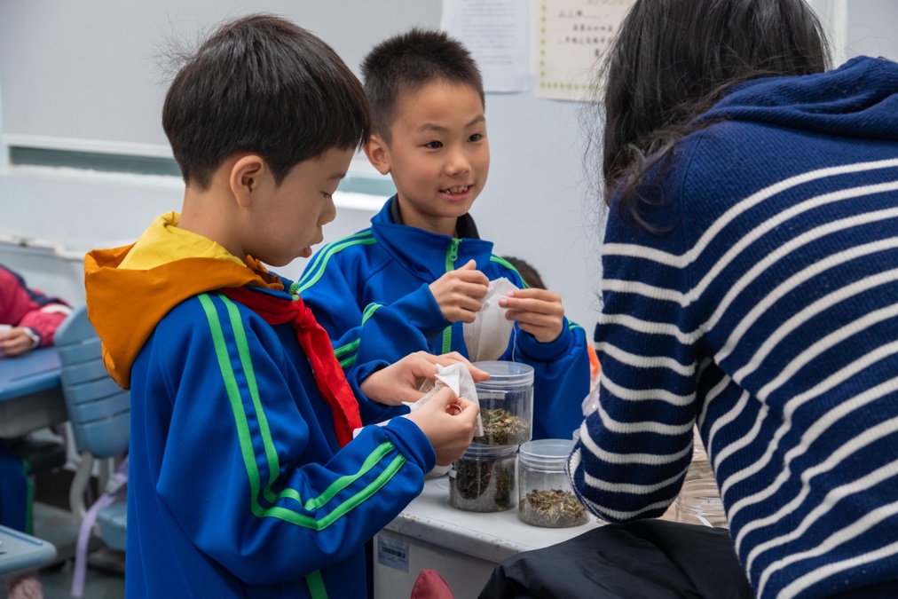 唐筱柔、康希儒同学向三(2)班简要介绍了中国四大传统节日之一的端午节。她们以端午节的起源和物候特征为背景,引出了端午的传统习俗之——香囊制作。古人认为端午节时邪气易聚,为驱邪护身,人们就会佩戴香囊。香囊中放有着各种香草,不仅能驱赶蚊虫,还可以使人神清气爽。学社成员们对香囊文化的细致讲解,让同学们感受到了其深厚的历史底蕴和独特艺术魅力。