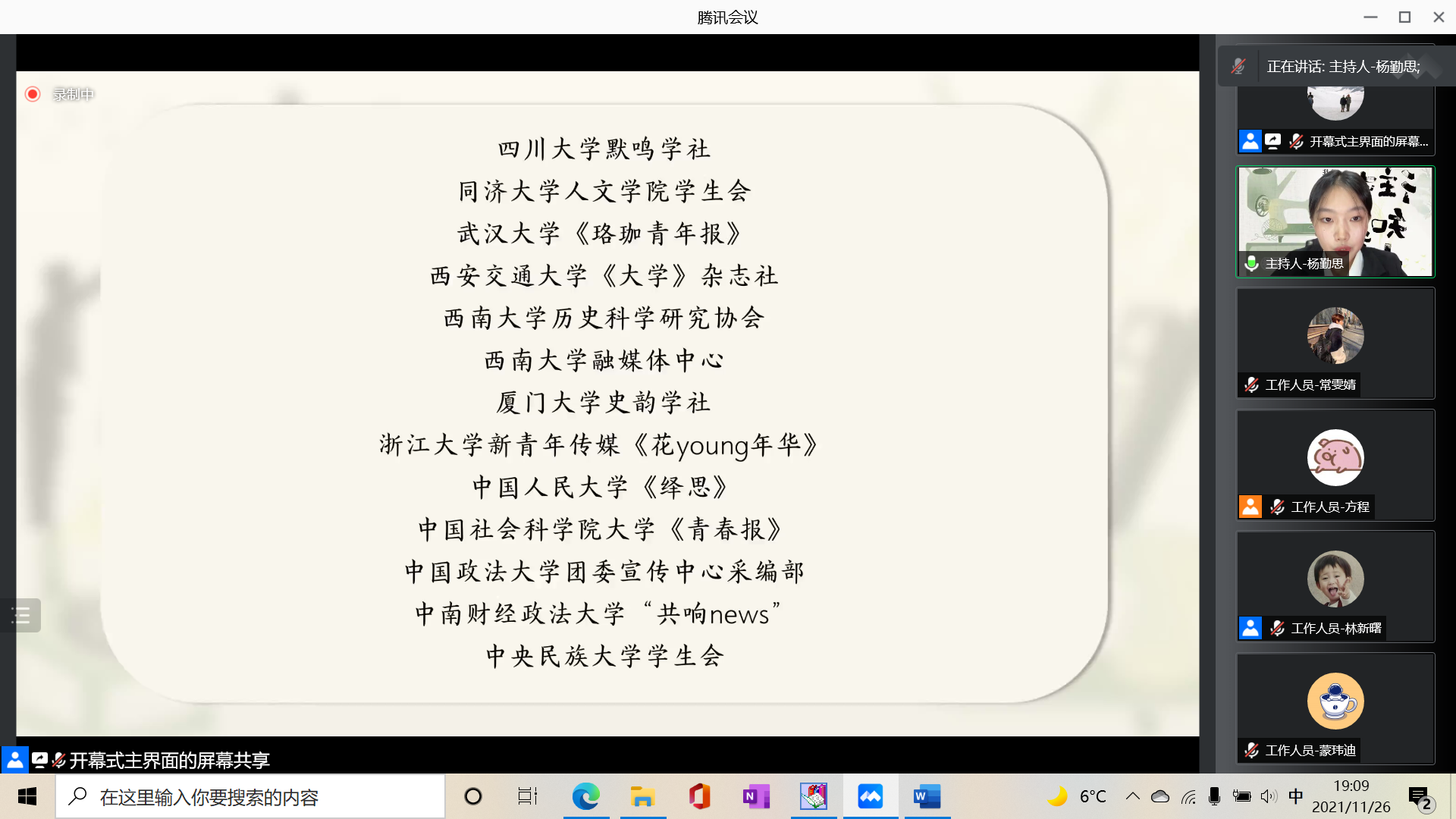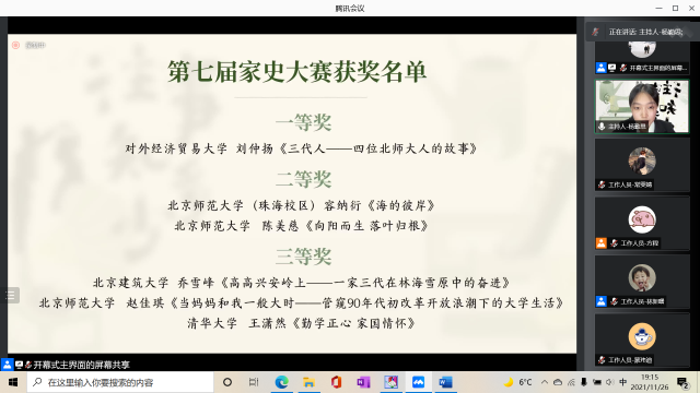 2021年11月26日晚七点,北京师范大学春秋人文报社采用线上的方式成功举办第八届“全国高校大学生家史大赛”开幕式。