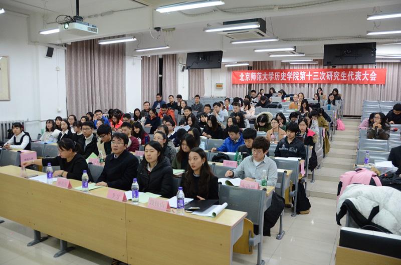 2017年11月24日晚7时,历史学院第十三次研究生代表大会在教二108顺利召开,出席此次代表大会的院系老师有:历史学院院长杨共乐老师,历史学院分团委书记胡小溪老师,历史学院专职辅导员李力老师;邀请到会的嘉宾有:校研究生会副主席段钰山同学,生命科学学院研究生会主席邵启睿同学,生命科学学院研究生会文体部部长金东乔同学,文学院研究生会副主席苗帅同学,体育与运动学院研究生会主席李少杰同学,汉语文化学院研究生会主席姜凯琳同学,地理科学学部研究生会干事王桢祎同学,系统科学学院研究生会学术部部长王伟嘉同学,统计学院研究生会主席孙煜同学,法学院研究生会副主席申姝祺同学,历史学院69名研究生代表出席此次大会。