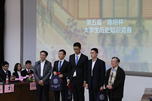 2015年11月15日晚,由【华体会网】分团委主办,历史学院学生会、春秋学社、春秋人文报、“形势与政策”小组协办的第五届“陈垣杯”高校历史知识竞赛在教九502圆满落幕。著名历史学家、【华体会网】教授陈其泰,【华体会网】教授李志英,北京歌华文化发展集团总经理、历史学院校友李丹阳,美国联邦政府公务员、北京师范大学校友何其恩,比兰德投资公司总经理李肖燕,商务印书馆学术出版中心主任、历史学院校友郑殿华,中国社会科学院近代史研究所所长助理、历史学院校友黄春生作为特邀嘉宾莅临活动现场。北京师范大学党委副书记田辉,校党委宣传部部长方增泉,本科生工作处处长王洛忠,校团委书记袁慧,学生就业与创业指导中心主任白勇,学生心理咨询与服务中心常务副主任胡志峰,历史学院院长杨共乐,历史学院分党委书记耿向东,古籍与传统文化研究院院长张荣强,经济与工商管理学院分党委副书记葛玉良,化学学院分党委副书记贺利华,政府管理学院分党委副书记郭智芳,历史学院分党委副书记王卓凯以及资源学院分团委书记张行,化学学院分团委书记李希涓,物理学系分团委书记刘珊珊,系统科学学院分团委书记曾凡齐,经济与资源管理研究院刘华辰老师,环境学院毕艳林老师,水科学研究院蔡攀老师,古籍与传统文化研究院郭程秀老师,历史学院常书红老师、吴琼老师、胡进驻老师、湛晓白老师、李渊老师、曲柄睿老师、丁雨老师、胡小溪老师、李力老师、周一帆老师、李娟老师等我校领导和老师,以及来自四所高校的同学们出席了本次活动。