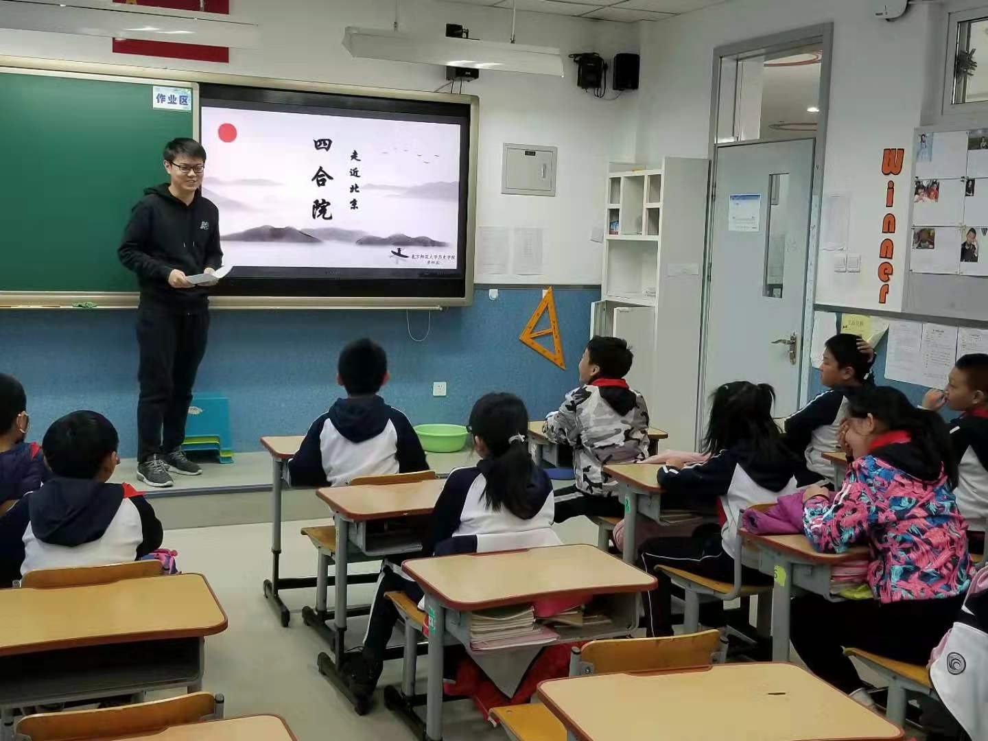 2019年11月4日,春秋学社开展本学期校尉小学第一次讲课活动,由历史学院2017级本科生褚邈主讲“北京的前世今生”课程。褚邈同学追溯了北京的古今面貌,细致呈现了北京的发展历程。课堂上,她询问学生们对北京的印象,并朗诵古诗《登幽州台歌》,师生间积极互动,气氛活跃。褚邈同学还展示了《家有儿女》、《康熙王朝》等经典影视作品辅助教学,让学生们感受北京的古今生活,可谓代入感十足。