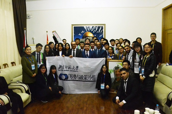 巴勒斯坦驻华大使特别代表萨拉赫·谢哈布(Salah Shehab)、一等秘书阿姆贾德·阿布希(AmjadAbuhit)、二等秘书阿姆贾德·哈马亚瑟(AamjadKhamayseh)、三等秘书穆罕默德·瓦义乐(Mohamad WaelHamidah)等巴方高级官员悉数莅临现场。我院“形势与政策”小组组长张慧,原组长宋文经,秘书长张铭,副组长赵文博、刘畅,外联顾问王聿闻等作为首都高校学生代表参加了活动。一同参加活动的还有选修我院“世界热点问题探源”课程的学生代表,清华大学、中国人民大学、国际关系学院等三所首都高校的学生代表和就读于国内多所高校的巴勒斯坦留学生代表。