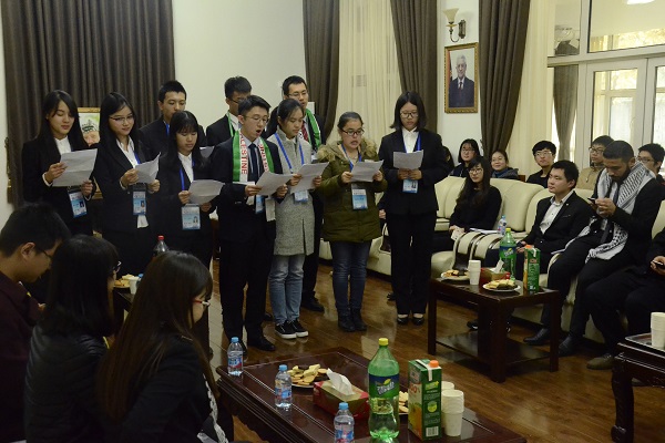 我院代表在发言中回顾了我院师生与巴勒斯坦驻华使馆十二年的友好交往,着重介绍了2011年出访巴勒斯坦的特别经历。同学们还为使馆方面献上了精心准备的小节目——歌曲合唱:“We Are The World”(《天下一家》),用歌声表达了对世界和平与团结的期待和对巴勒斯坦人民的祝愿,展现了青年学子对共同努力建设美好未来的责任感。动听的旋律感染着在场的每一个人,不少人不由自主地小声哼唱。