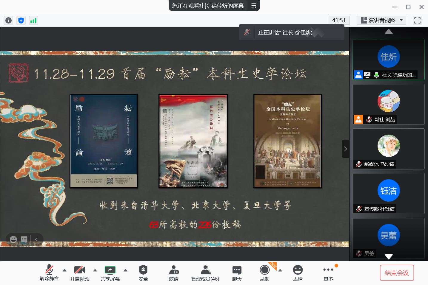 会议开始,社长徐佳炘同学回顾了自己两年来在学社的经历和收获,并且鼓励大家利用学社这个平台不断提高、充实自己。他强调,学社的工作看似简单,但大多需要合作完成,建议大家务必认真对待自己的工作。无论是对待历史学,还是对待学社的工作,严谨认真是第一要务。同时,他也希望在学社的日子能成为同学们大学时期珍贵的回忆。