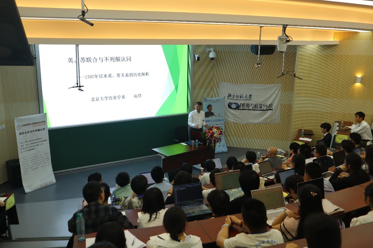 2023年5月18日晚,英国皇家历史学会会士、中国英国史研究会现任会长、北京大学历史学系教授(荣休)高岱应邀来到我校,在电子楼阶梯教室做了题为“英、苏联合与不列颠认同——1707年以来英、苏关系的历史探析”的讲座。本次讲座系北京师范大学励耘学术讲堂系列讲座,也是历史学院“古今世界 天下大观”——主要发达国家国情系列讲座的第十六讲。