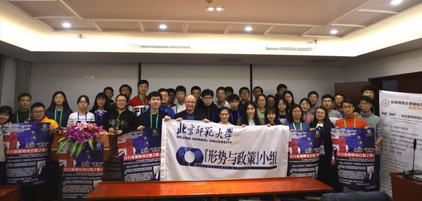讲座开始前,我校国际交流与合作处副处长刘敏老师礼节性会见了德瓦乐教授。德瓦乐教授首先用他的母语法语表达了受邀来到北京师范大学讲学的兴奋与喜悦之情。他特别强调,这是他此行来华后首次接受来自学生团体的邀请赴高校讲学。他概括指出:英国“脱欧”的现状在整体上具有很强的不确定性:“脱欧”尚未形成定局,当下情势始料不及,未来亦充满多种可能。他继而回顾了英国与欧陆国家交往的历史进程,指出经济利益而非政治联系是英国与欧盟关系中的最主要因素。